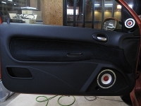 ドアの形状に合わせてバスレフエンクロージュアを制作したうえでC-130Ⅱ Sunriseをセットしました。純正スピーカーの位置がドアのほぼ中央に位置していましたが併せて位置も変更しました。 |