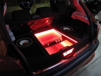 リアラゲッジにはシステムの中核を担うAZ-1CC Sunriseを始めP-1 SunriseとC-180Ⅱ SunriseをアクリルとLEDを用いた「魅せる」仕様でセットしました。ラック内にはV-50 Sunriseが2台収納されシステムにクリーンかつ安定した電源供給を行います。 |